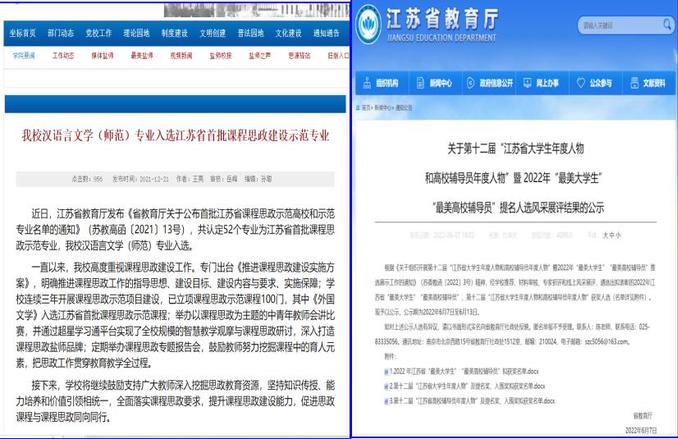 辛勤耕耘,学院专业建设喜结硕果。2019年汉语言文学专业获批国家一流本科专业建设点、江苏省成人高等教育重点专业;汉语言文学(师范)专业通过国家师范专业二级认证复评工作、完成秘书学专业论证工作,2020年完成广播电视新闻学专业认证工作;《劳动成就梦想——劳动教育理论与实践》入选江苏省重点教材。2021年“新文科建设背景下中华传统优秀文化创造性转化的研究与实践”获批教育部首批新文科建设理论与实践项目,《语文课程与教学论新编》获批江苏省重点教材立项,“新文科背景下汉语言文学专业师范生中华文化传承能力培养的探索与实践”获批2021年江苏省教改研究重点课题,汉语言文学专业获批江苏省思政特色建设专业。